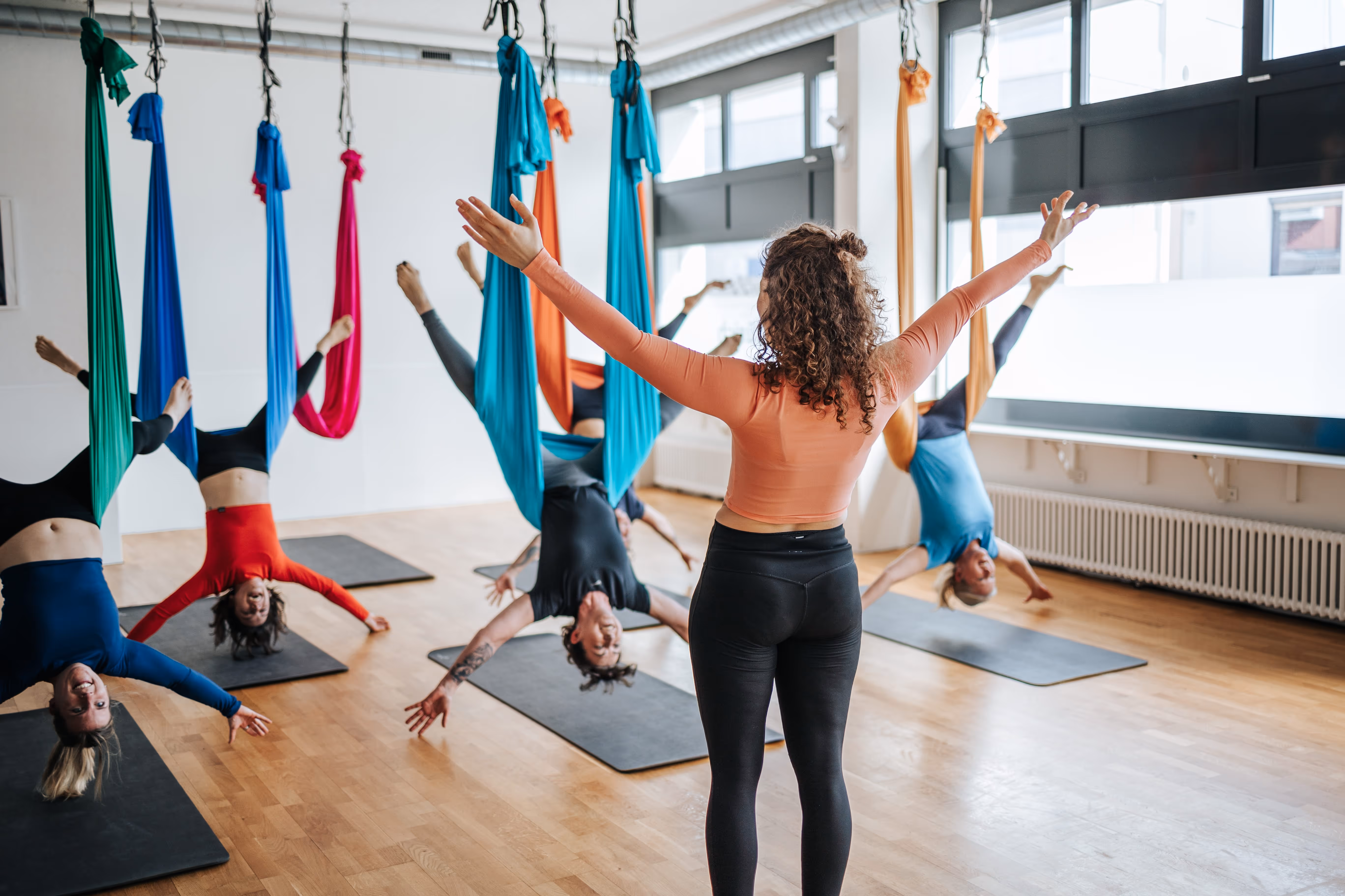 Unser Aerial Yoga verbindet die Erdung traditioneller Yogapraxis mit der schwebenden Leichtigkeit der Luftakrobatik. In einem von der Decke hängenden Tuch, ähnlich einer Hängematte, erlebst du bekannte Yoga Positionen und Pilates Elemente aus einer völlig neuen Perspektive
